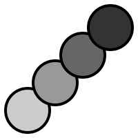 Draw four circles placed on the bottom left – top right canvas diagonal. Circles fill color should change from light to dark grey, following the diagonal direction. Then, assign a boolean value to an identifier called “firstLightThenDark”. This variable should allow the user to decide in which direction the circles should be drawn.